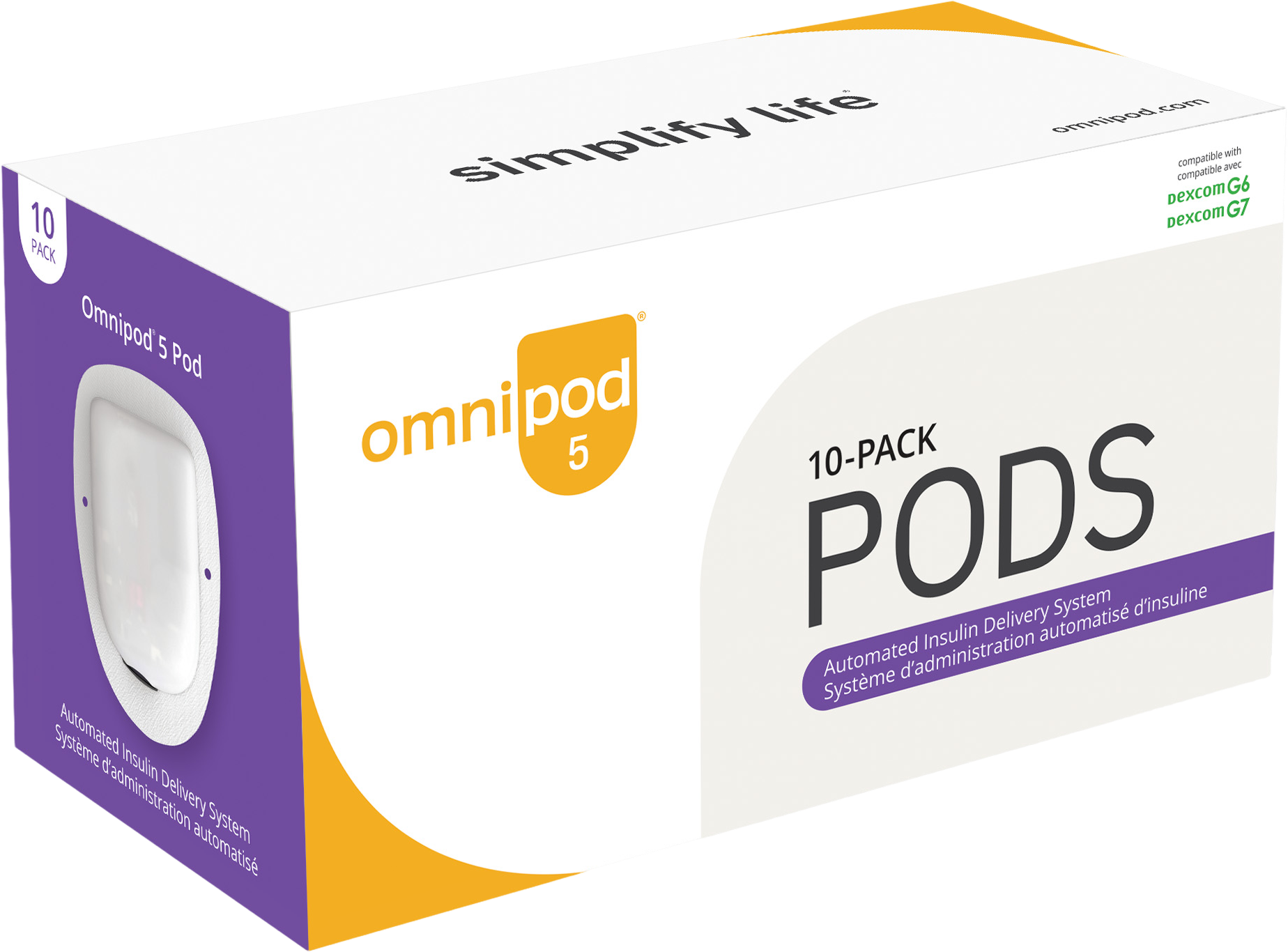 The same tubeless pod design, now compatible with Omnipod 5's automated insulin delivery system. Controlled from your smartphone with Dexcom G6 integration.
